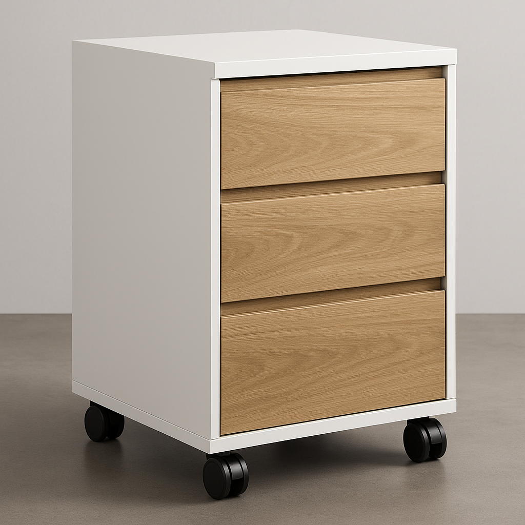 Carrello compatto con ruote morbide, 3 cassetti scorrevoli e frontali in rovere: ideale per strumenti, lame e prodotti. Robusto, silenzioso, pensato per parrucchieri e estetica.